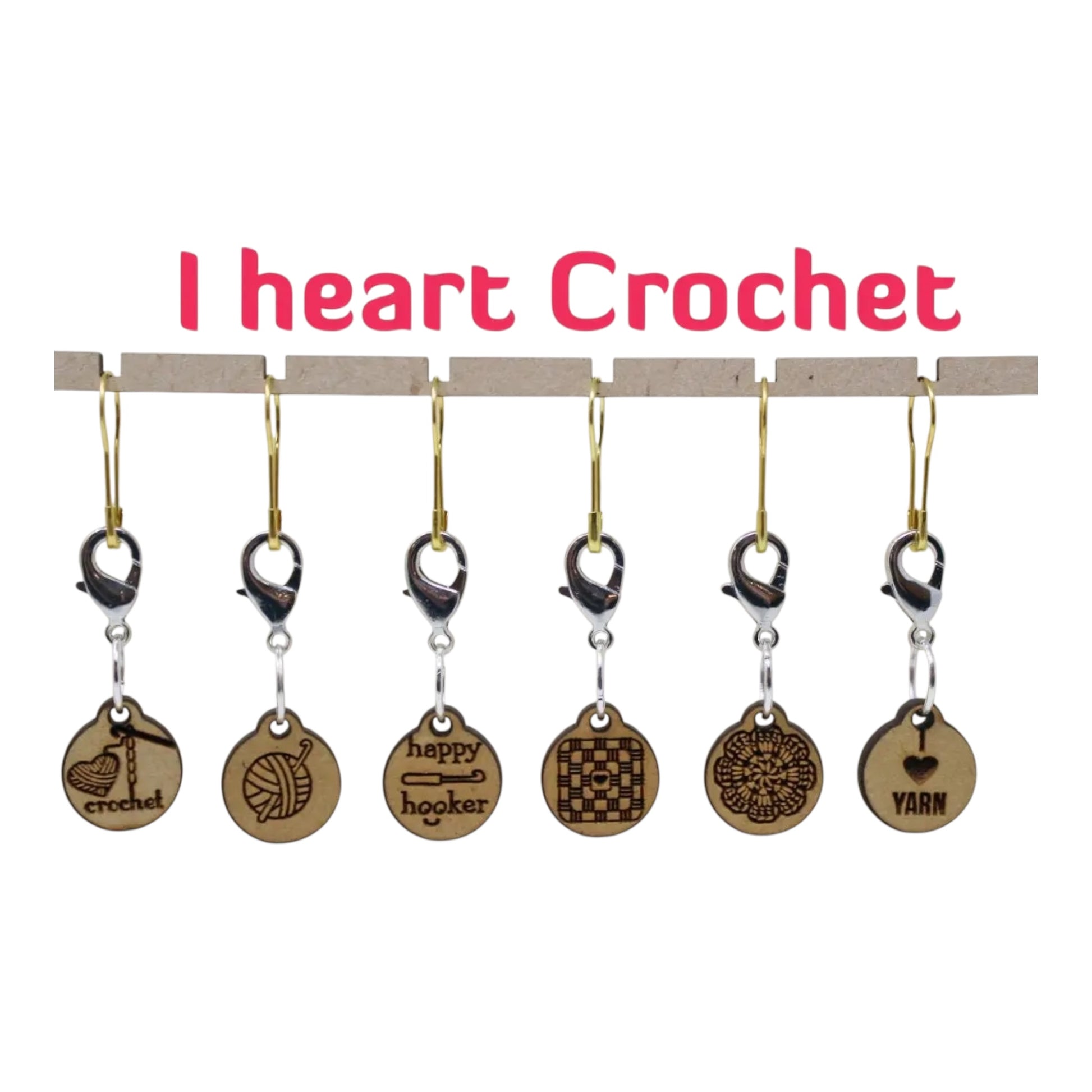 Set of 6 wood markers that include different designs for the crochet lover. Removable markers that can be used for knitting or crochet. These crochet markers come with a 15mm clasp that opens easily to attach to your project. They can also be used in knitting as progress keepers.